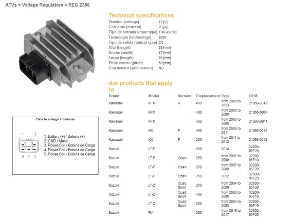 DZE REGULATOR NAPIĘCIA KAWASAKI KX 250F '11-'12; KX 450F '09-'11; KFX 400 '03-'06; KFX 450R '08-'13; SUZUKI LT-F 250 OZARK '02-' DZE ELEKTRYKA