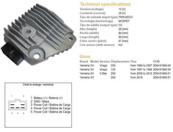 Dane techniczne Napięcie 12 [V Prąd 35 [A] Typ wejścia Typ wejścia TRZY FAZY Technologia MOSFET Typ wyjścia DC Wysokość 28 [mm] Szerokość 80 [mm] Szerokość 80 [mm] Długość 90 [mm] Długość 90 [mm Od środka do środka (skok) 67 [mm] Z czujnikiem NO Zastosowania Yamaha XV Virago 250 od 1996 do 2007 3DM-81960-00 Yamaha XV Virago 125 od 1997 do 1998 3DM-81960-00 Yamaha XV V-Star 250 od 2008 do 2015 3DM-81960-01 Yamaha XV 250 od 2016 3DM-81960-01 Gwarancja dotyczy tylko montażu w serwisie wyspecjalizowanym w obsługę instalacji elektrycznych - po przedstawieniu zaświadczenia z serwisu montującego.